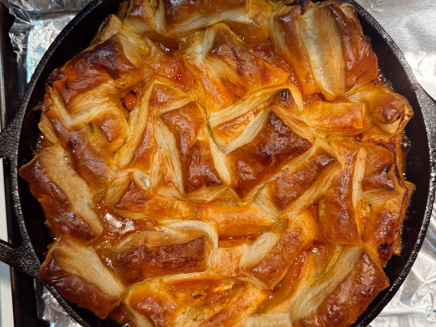 Bake: Place the skillet on a foil-lined baking sheet (to catch overflow). Bake for 25–30 minutes, or until the pastry is golden and puffed.